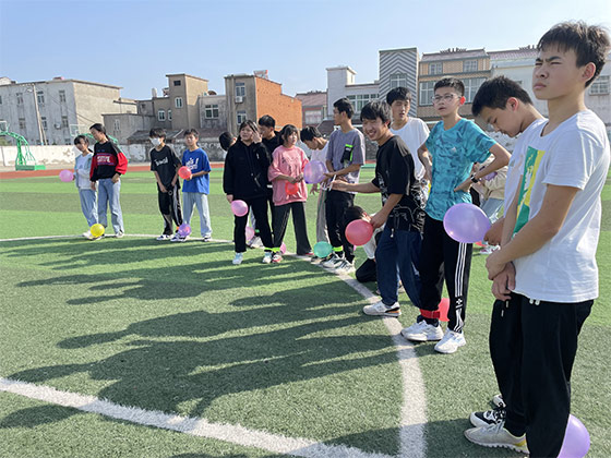 活動(dòng)開始,王老師用“桃花朵朵開”這個(gè)游戲活躍氣氛,幫助同學(xué)們拉進(jìn)彼此的距離,投入到活動(dòng)當(dāng)中來;在“星球大戰(zhàn)”的游戲中,同學(xué)們兩兩一組,在守衛(wèi)自己小組的氣球同時(shí),要設(shè)法踩破其他小組的氣球。守衛(wèi)與對抗,競爭與合作,這些看似對立的詞語在這場活動(dòng)中和諧共生,讓孩子們緊緊地結(jié)合在了一起。在動(dòng)力圈環(huán)節(jié)中,王老師讓同學(xué)們圍坐一圈,手抓一個(gè)大繩圈,通過向后仰的方式,將繩圈用力繃緊,然后邀請一位挑戰(zhàn)者在繩圈上行走。對于所有的參與者來說,這都是一個(gè)勇氣和信任的大挑戰(zhàn)?;顒?dòng)的最后,王老師讓同學(xué)們在彩色便簽紙上寫下對未來的期許和同伴的祝福,讓大家感恩一起走過的日子,一起向未來,去遇見更美的自己。